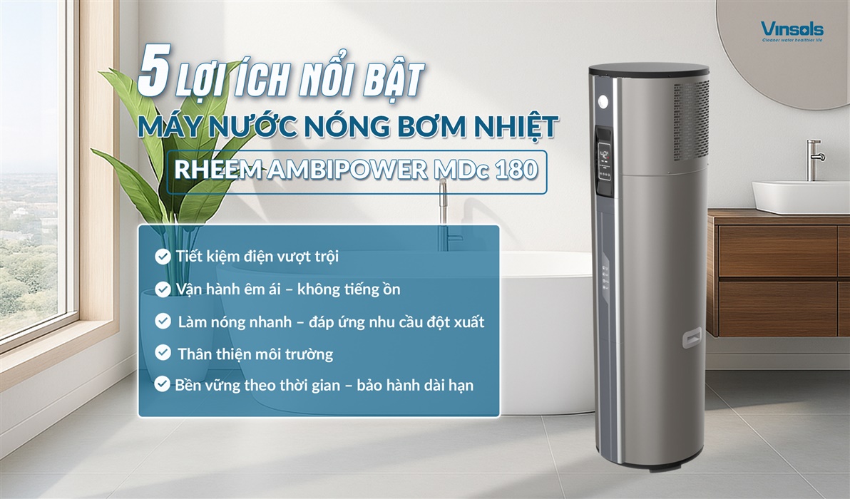 Máy nước nóng Rheem AmbiPower MDc-180 tích hợp nhiều công nghệ tiên tiến, mang lại hiệu suất vượt trội và trải nghiệm tiện nghi chuẩn Mỹ: