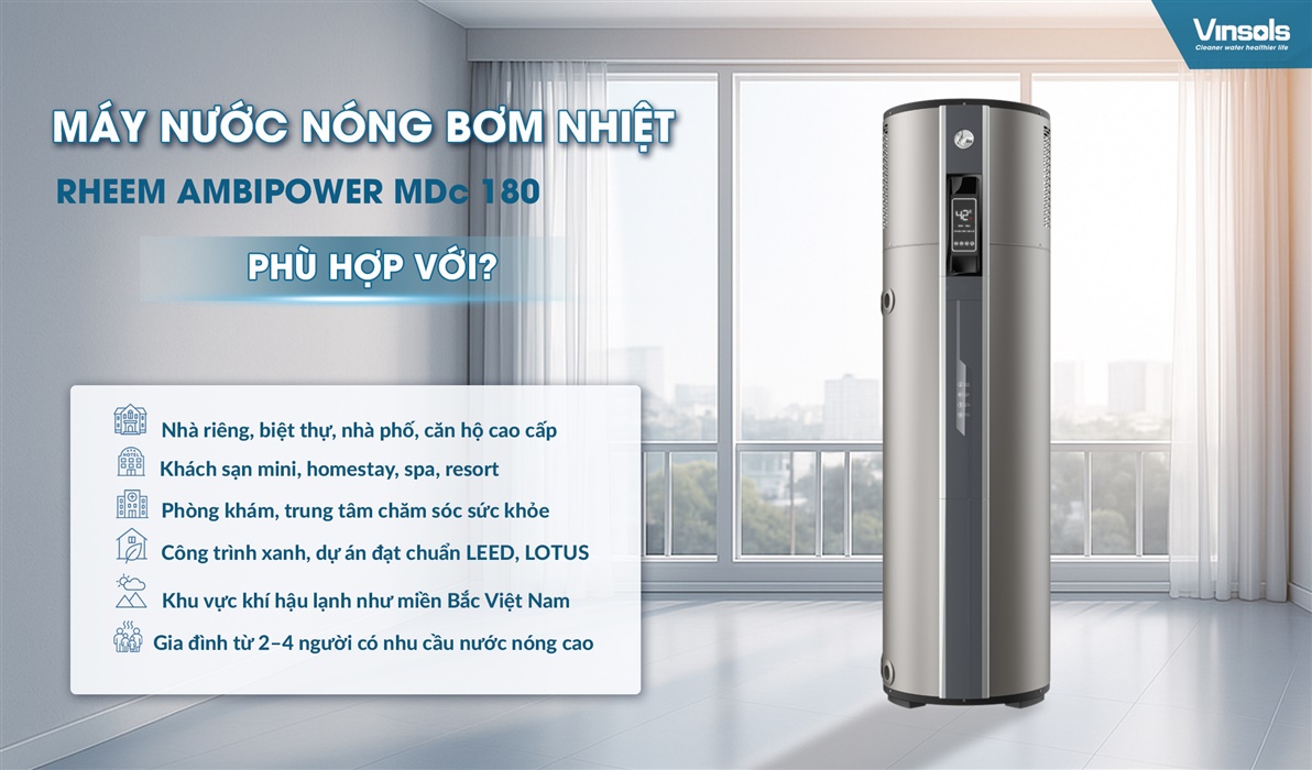 Máy nước nóng bơm nhiệt Rheem AmbiPower MDc 180 với dung tích 178 lít là giải pháp lý tưởng cho nhiều loại hình nhà ở và đối tượng khách hàng khác nhau, mang đến sự tiện nghi và tiết kiệm vượt trội: