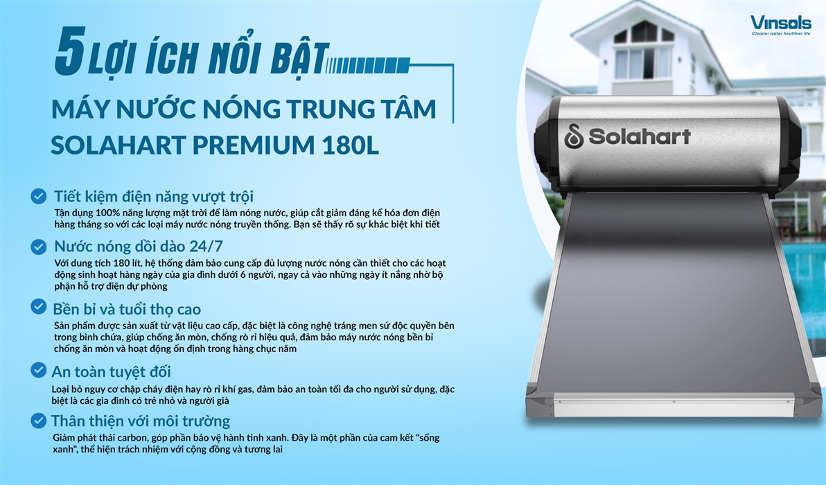 Dùng máy nước nóng năng lượng mặt trời Solahart Premium 180 Lít mang lại nhiều ưu điểm vượt trội: