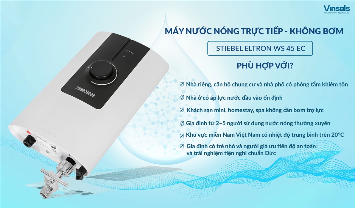 Máy nước nóng trực tiếp Stiebel Eltron không bơm WS 45 EC là giải pháp lý tưởng cho nhiều loại hình nhà ở và đối tượng khách hàng, đặc biệt phù hợp với những khu vực có khí hậu ấm áp (nhiệt độ môi trường trên 20°C), như miền Nam Việt Nam. Sản phẩm là lựa chọn tối ưu cho: