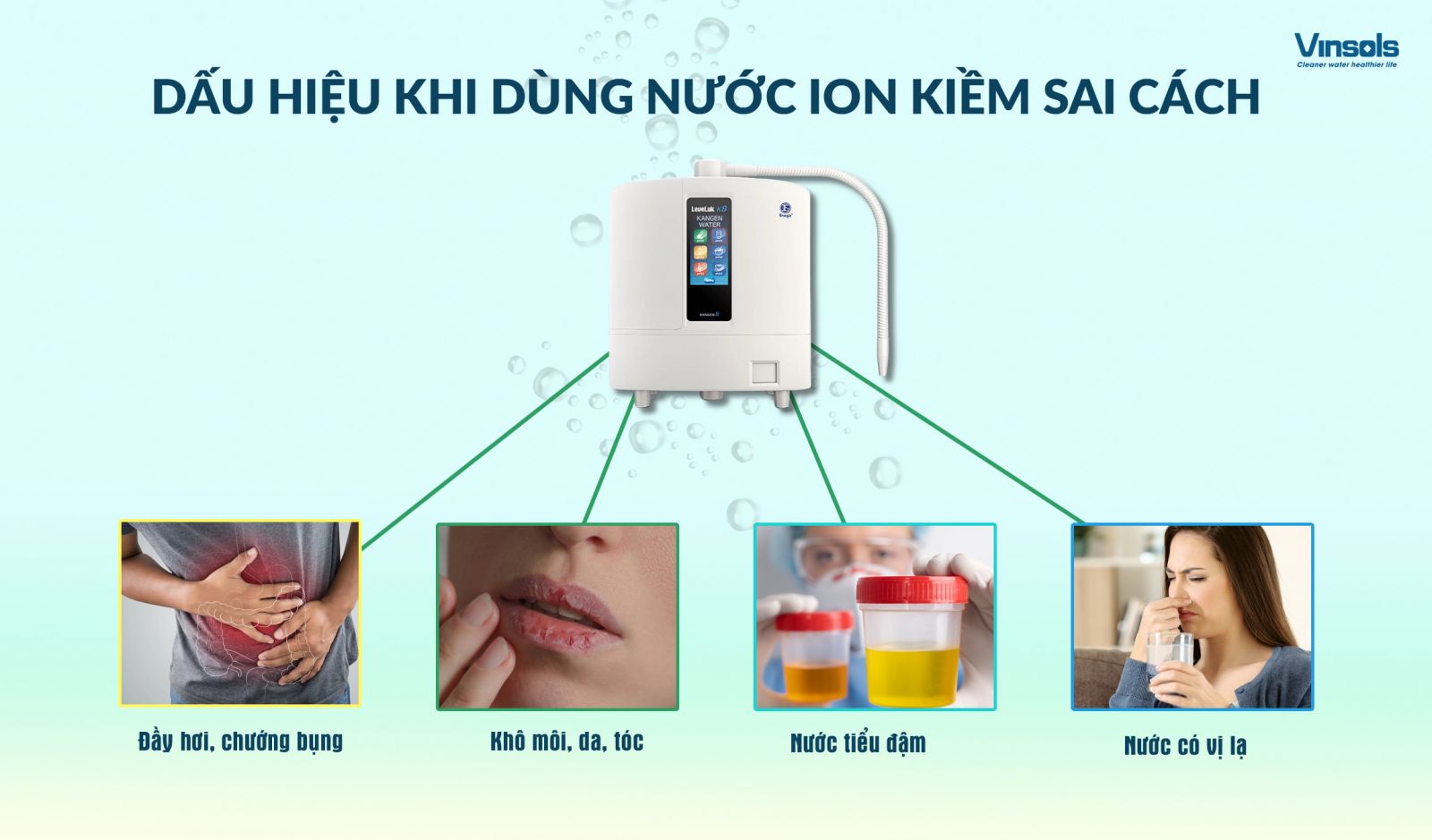 =>Theo chuyên gia Vinsols, những biểu hiện này cho thấy cơ thể hoặc hệ thống điện giải đang mất cân bằng – cần kiểm tra lại máy hoặc điều chỉnh cấp độ pH phù hợp hơn.