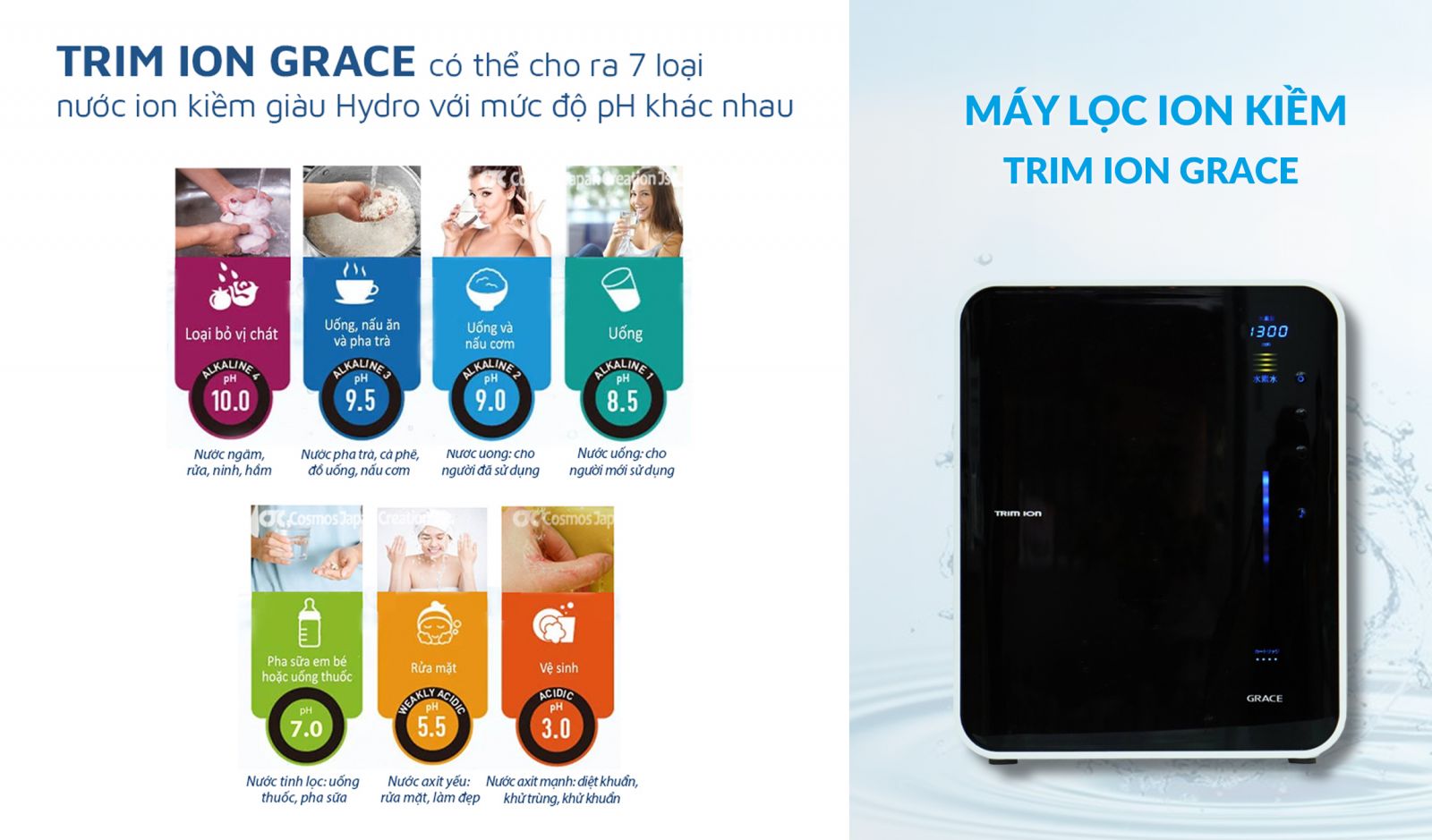 Máy lọc nước ion kiềm Trim-Ion Grace có khả năng tạo ra 7 chế độ nước khác nhau, đáp ứng mọi nhu cầu sử dụng chuyên biệt trong gia đình: